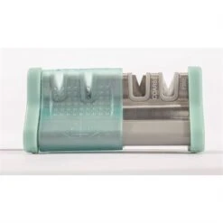 Model – AC129. 3-in-1 Sharpening System. Dimensions: 8 inch x 2 inch. Features pre-aligned carbides for quick edge setting, 750 grit interrupted surface diamond sharpener and pre-aligned ceramic sharpeners for sharpening standard and serrated blades. Rods store in base. Hang packaged.