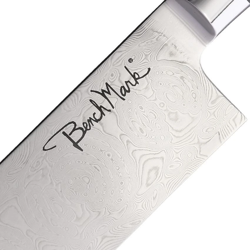 Model/Part Number – BMK123. Benchmark Chopper Japanese Damascus. 12.25″ (31.12cm) overall. 7″ (17.78cm) Japanese Damascus blade. Curly birch and blue resin handle. Black plastic sheath. Boxed. Made in China.