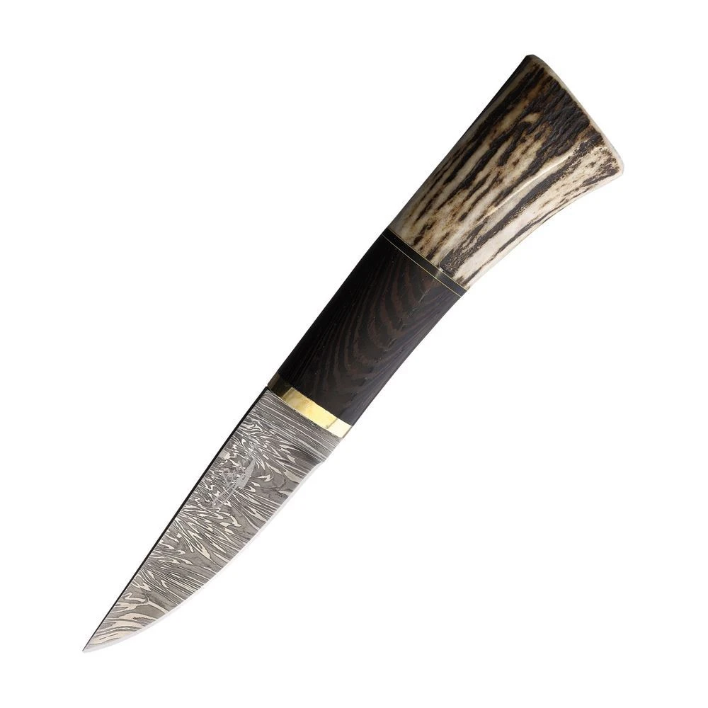 Model – BKA022. Fixed Blade Stag/Wood. 7.63 inch (19.38cm) overall. 3.5 inch (8.89cm) Damascus steel blade. Stag, wenge wood and brass handle. Brown leather belt sheath. Bulk packed.