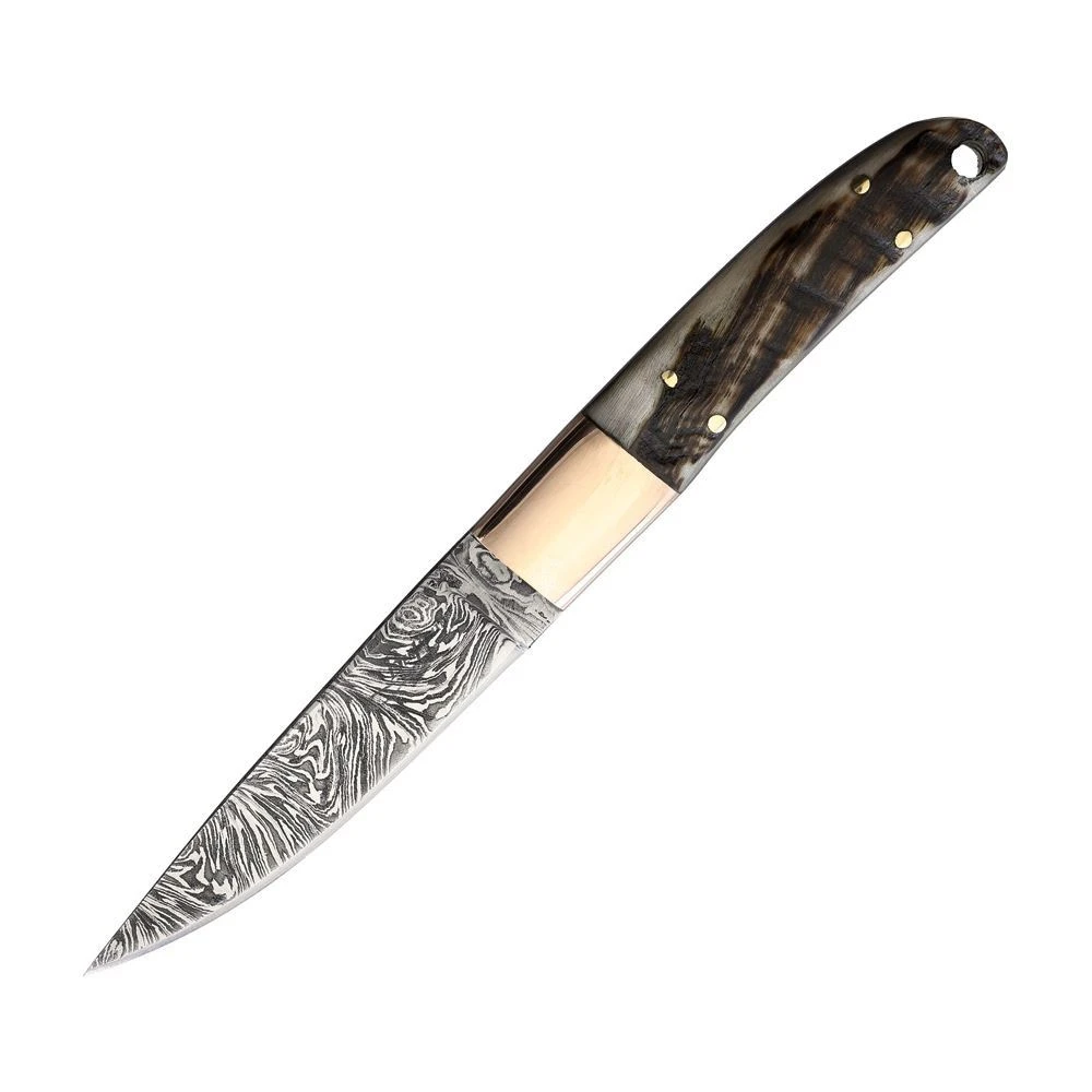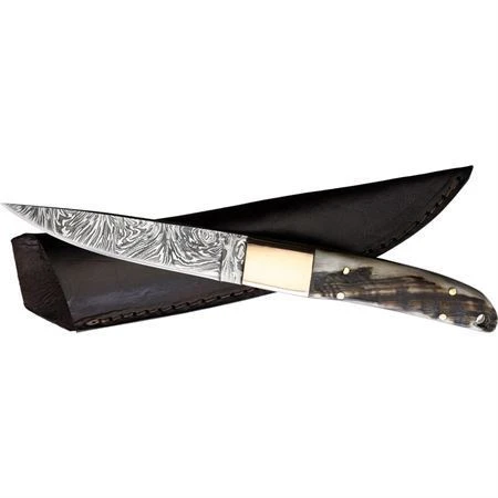 Model – BKA034. BenJahmin Fixed Blade Ram Horn. 8.88″ (22.56cm) overall. 4.25″ (10.8cm) Damascus steel blade. Ram’s horn handle. Copper bolster(s). Full tang. Lanyard hole. Black leather belt sheath. Bulk packed. Made in Pakistan.