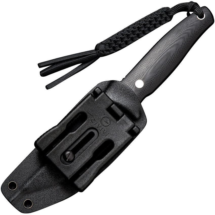 Model – CIVC190463. Civivi Tamashii Fixed Blade. 8.88″ (22.56cm) overall. 4.13″ (10.49cm) black stonewash finish D2 tool steel blade. Black canvas micarta handle. Full tang. Lanyard hole. Black Kydex belt sheath. Boxed. Made in China.