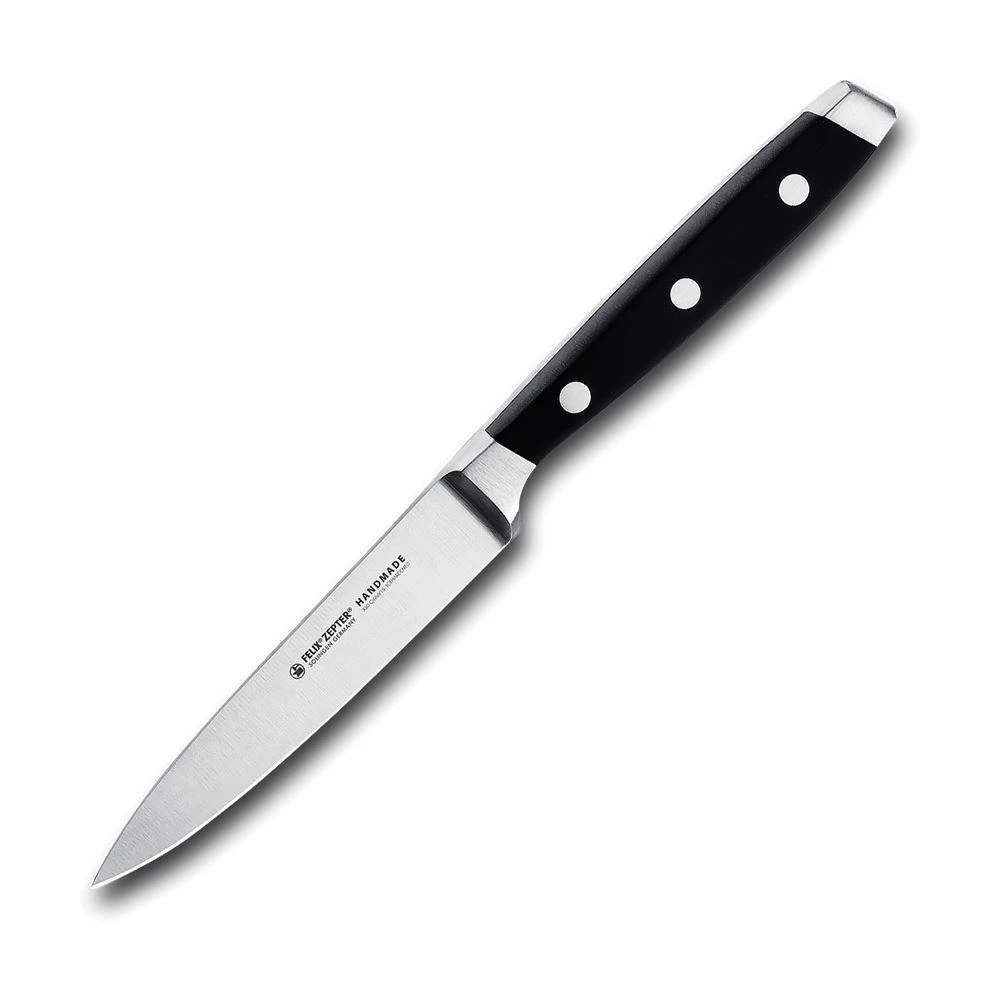 Model – FEL811010. FELIX 4in Paring Knife. 7.5″ (19.05cm) overall. 4″ (10.16cm) satin finish X50CrMoV15 stainless blade. Black plastic handle. Stainless bolster(s). Stainless pommel. Boxed. Made in Germany.