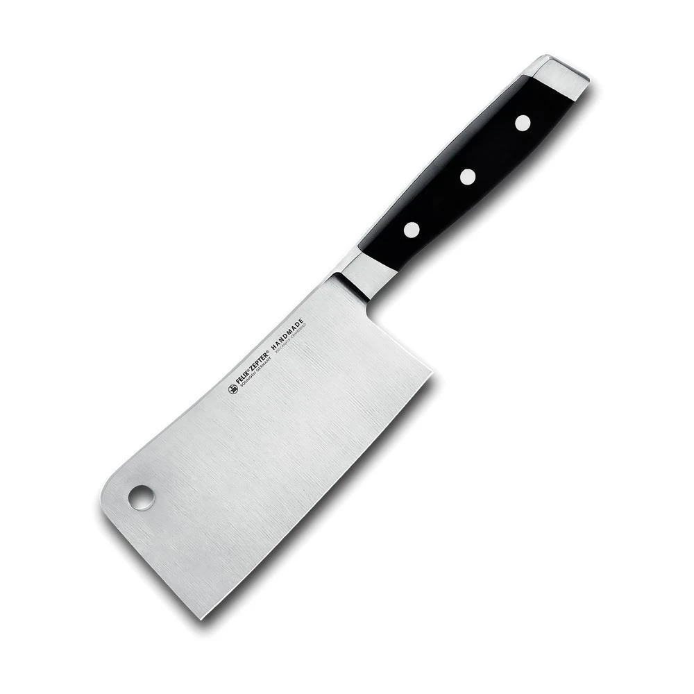 Model – FEL819016. FELIX 6in Cleaver. 11″ (27.94cm) overall. 6″ (15.24cm) satin finish X50CrMoV15 stainless blade. Black plastic handle. Stainless bolster(s). Stainless pommel. Boxed. Made in Germany.