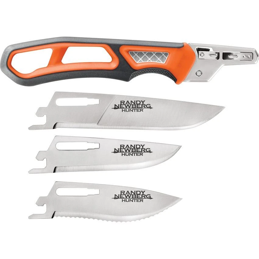 Model/Part Number – G3857. Gerber Randy Newberg EB System. 440 stainless blade. Black and orange rubberized polypropylene handle. 5″ handle. Durable and reusable blades (Task blade, Backstrap blade, Serrated Breakdown blade). Split Sec Tec tool-less blade replacement with push button release. Retro-reflective handle material. Quiet carry blade box. English and French language packaging. Clam packed. Made in China.