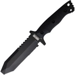 Model/Part Number – HBBMUK01. Hardcore Hardware Australia EOD Dive Knife. 10.25″ (26.04cm) overall. 5″ (12.7cm) black Teflon coated partially serrated Bohler N690 stainless blade. Black G10 handle. Full, extended tang. Lanyard hole. Modified chisel point blade. Sheath comes with Tek-Lok and MOLLE-Lok mounting options. Black Kydex MOLLE compatible belt sheath. Boxed. Made in Australia.