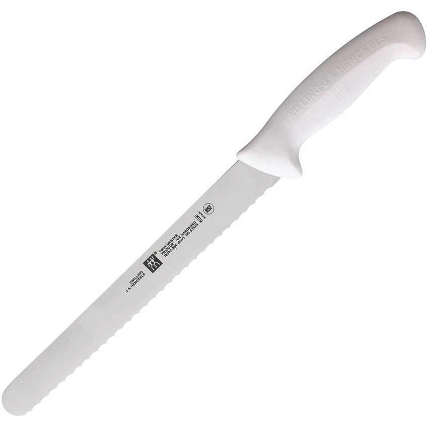 Model/Part Number – HEN32302254. Henckels Knives Twin Master Serrated Slicer. 15.5″ (39.37cm) overall. 10″ (25.4cm) satin finish serrated stainless blade. White plastic handle. Hang packaged. Made in Spain.