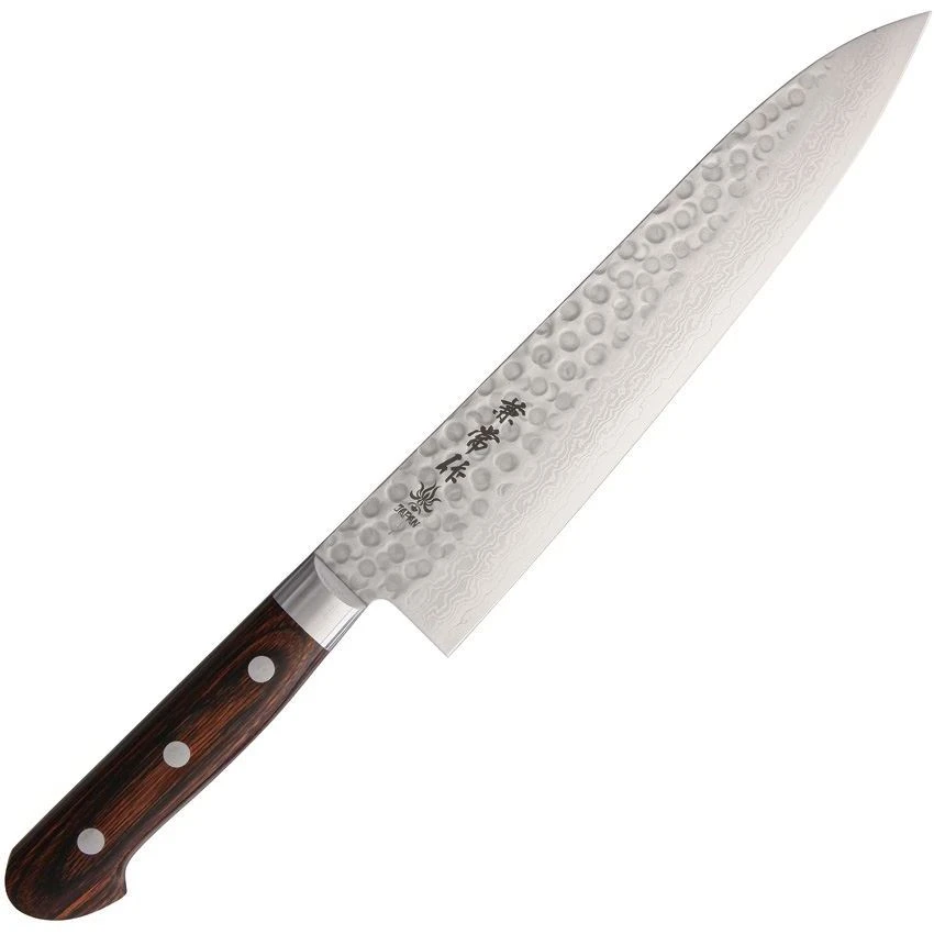 Model – KC902. Gyutou Chef Knife. 13.25 inch overall. 8.5 inch hammered finish VG-10 Damascus steel blade. Brown laminated wood handle. Stainless guard. Full tang. Full tang. Boxed.