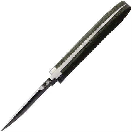 Model – KO026. 8.5 inch (21.59cm) overall. 3.5 inch (8.89cm) satin finish 7Cr17MoV stainless clip point blade. Green canvas micarta handle. Stainless guard. Full tang. Lanyard hole. Black leather belt sheath. Boxed. Made in China