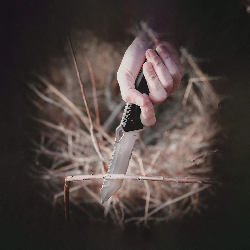 - 5.5″ (13.97cm) matte finish partially serrated 420 stainless tanto blade