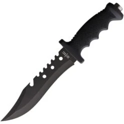 Model – STT228700. S-TEC 228700 – Fixed Blade. 13″ (33.02cm) overall. 7.5″ (19.05cm) black finish sawback stainless blade. Black finger grooved ABS handle. Black ABS belt sheath. Boxed. Made in China.
