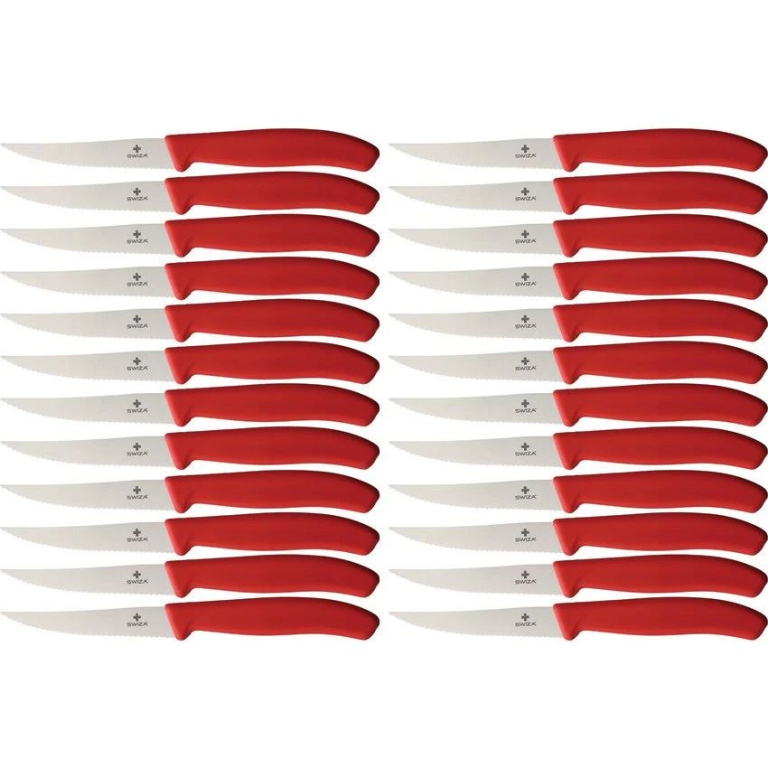 Model – SZAT011110. Swiza T011110 – Steak Knife Box of 24. 8.5″ (21.59cm) overall. 4″ (10.16cm) satin finish serrated stainless blade. Red plastic handle. Pack of 24. Boxed. Made in Switzerland.