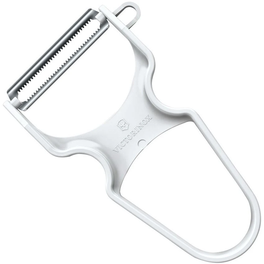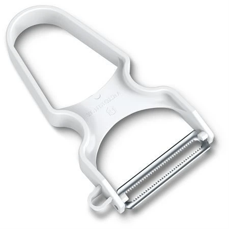 Model – VN60933. Rapid Peeler Serrated. 5.5 inch (13.97cm) overall. White ABS handle. Ultra sharp serrated blades. Lateral potato eye remover. Boxed with hanging tab. Made in Switzerland.