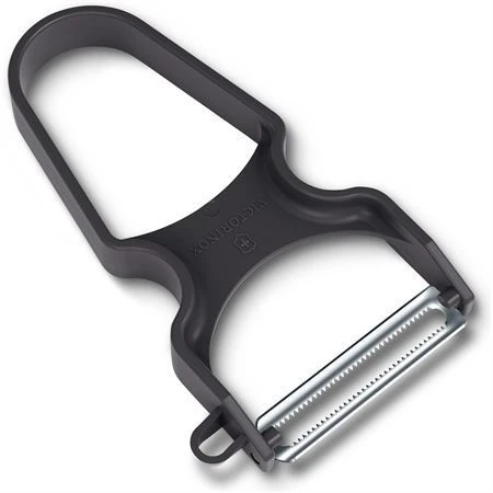 Model – VN609333. Tomato/Kiwi Peeler. 5.5 inch (13.97cm) overall. Black ABS handle. Dishwasher safe. Ultra sharp serrated blades. Lateral potato eye remover. Boxed with hanging tab. Made in Switzerland.