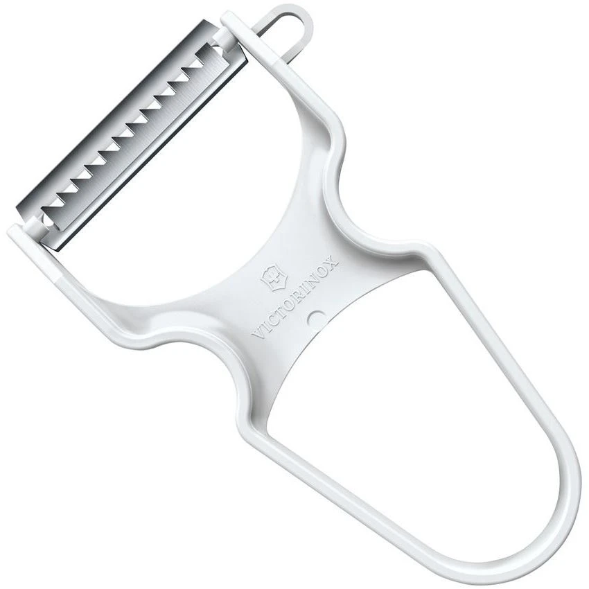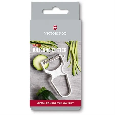 Model – VN60934. Rapid Peeler Julienne White. 5.5 inch (13.97cm) overall. White ABS handle. Ultra sharp Julienne blades. Lateral potato eye remover. Boxed with hanging tab. Made in Switzerland.