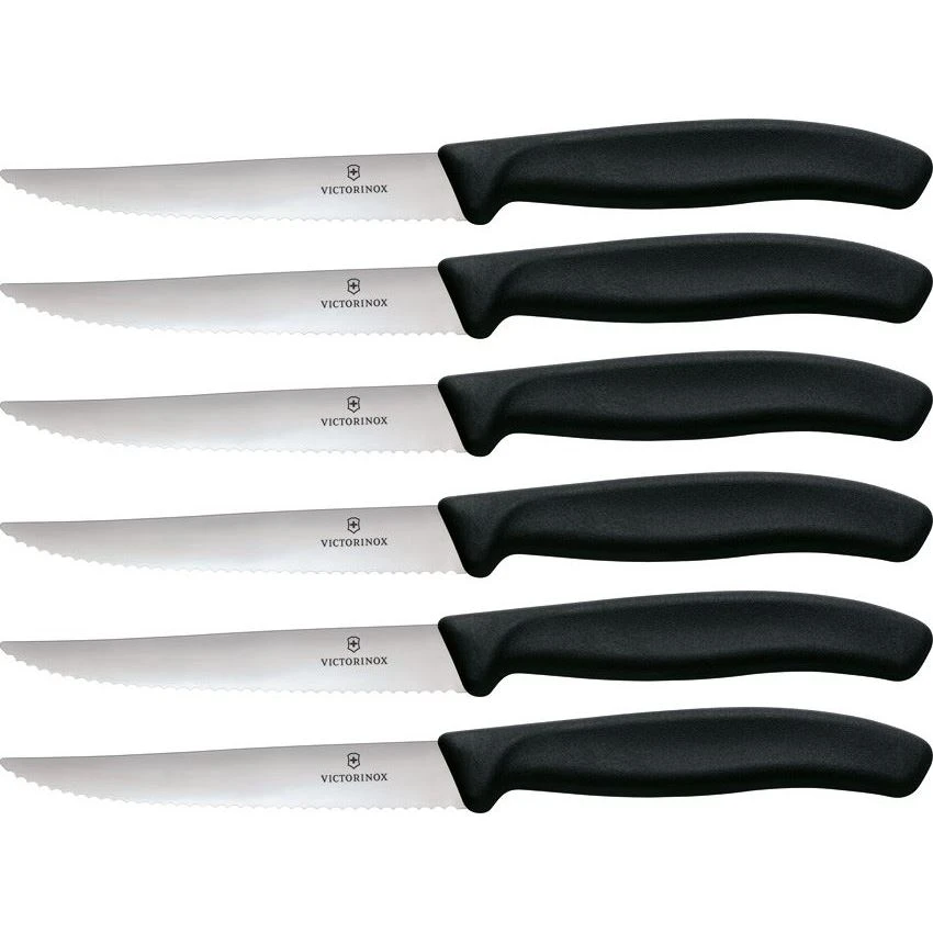 Model/Part Number – VN6723320X2. Swiss Army Knives Steak Knife Set 6pc Black. 8.5″ (21.59cm) overall. 4.25″ (10.8cm) satin finish serrated stainless blade. Black TPE handle. Dishwasher safe. Set of six. Boxed with hanging tab. Made in Switzerland.