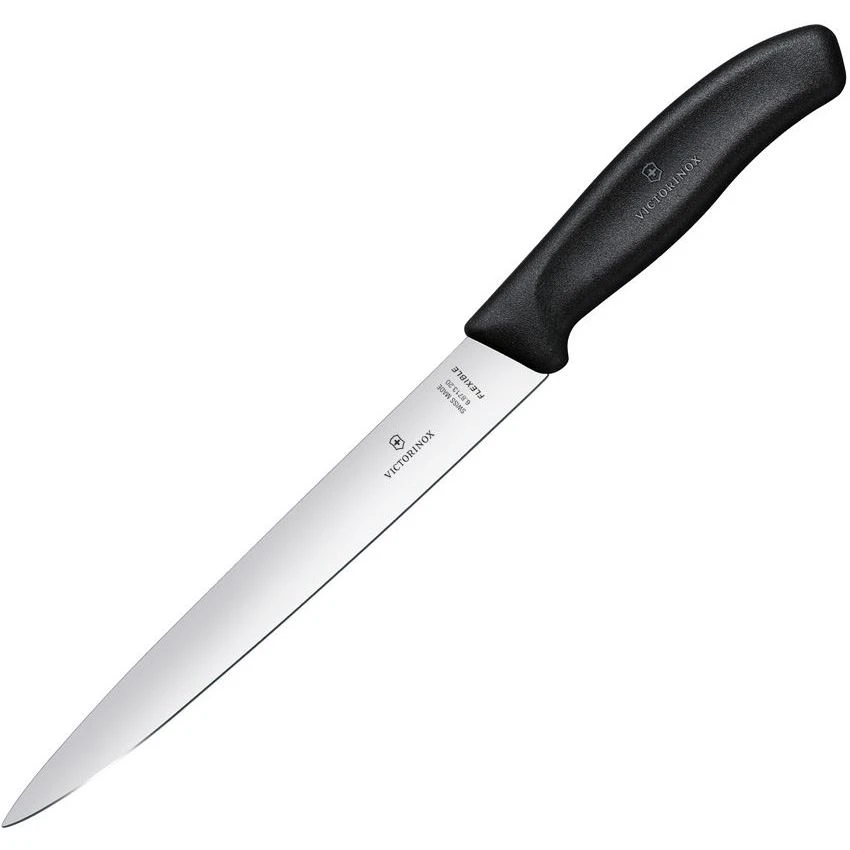 Model/Part Number – VN6871320X2. Swiss Army Knives Fillet Knife 8in Black. 13″ (33.02cm) overall. 8″ (20.32cm) satin finish stainless blade. Black TPE handle. Dishwasher safe. Boxed with hanging tab. Made in Switzerland.