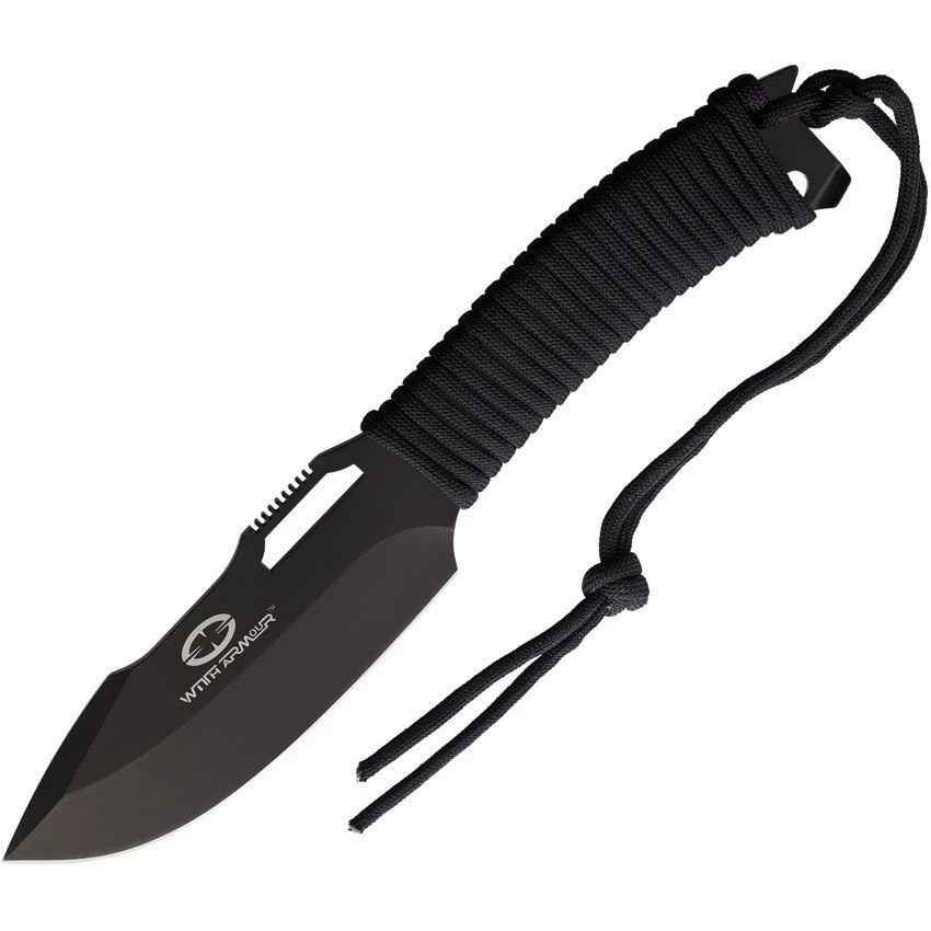 Model – WAR003BK. WithArmour 003BK – Yaksha Fixed Blade. 9″ (22.86cm) overall. 4.25″ (10.8cm) black finish 440C stainless blade. Black cord wrapped handle. Lanyard hole. Black nylon belt sheath. Boxed. Made in China.