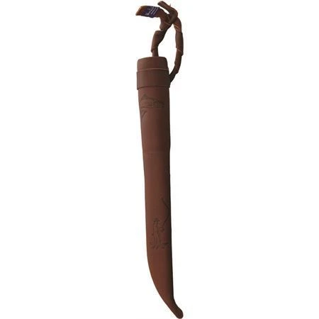 Model – WJ23FP. Wood Jewel Knives 23FP – Fillet Knife. 10.75″ (27.31cm) overall. 6.25″ (15.88cm) satin finish stainless fillet blade. Curly Birch handle. Reindeer horn pommel. Horn spacers. Fish on sheath. Due to the natural materials used, knife dimensions could vary. Brown leather belt sheath. Bulk packed. Made in Finland.