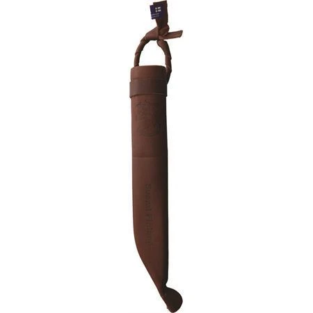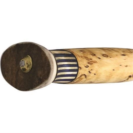 Model – WJ23LION13. Wood Jewel Knives 23LION13 – Large Lion Knife. 9.75″ (24.77cm) overall. 5″ (12.7cm) carbon steel blade. Curly Birch handle. Blade etching. Blue and white color wood spacers. Finland shield on sheath. Brown leather belt sheath. Bulk packed. Made in Finland.